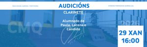 [ Audicións de Clarinete: alumnado de Paula, Lorena e Cándido ] > Xoves, 29 de xaneiro de 2026 · 16:00 horas / 19:00 horas · Auditorio do CMUS Manuel Quiroga, Pontevedra