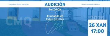 [ Audición de Saxofón: alumnado de Pablo Estellés ] > Luns, 26 de xaneiro de 2026 · 17:00 horas · Auditorio do CMUS Manuel Quiroga, Pontevedra