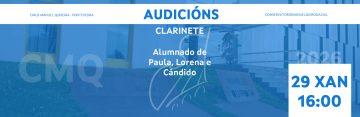 [ Audicións de Clarinete: alumnado de Paula, Lorena e Cándido ] > Xoves, 29 de xaneiro de 2026 · 16:00 horas / 19:00 horas · Auditorio do CMUS Manuel Quiroga, Pontevedra