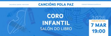 [ Cancións pola Paz: o Coro Infantil, no Salón do Libro de Pontevedra ] Dir. Nanette Sánchez > Sábado, 7 de marzo de 2026 · 19:00 horas · Pazo da Cultura de Pontevedra +info: web do Salón do Libro Máis info ...